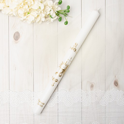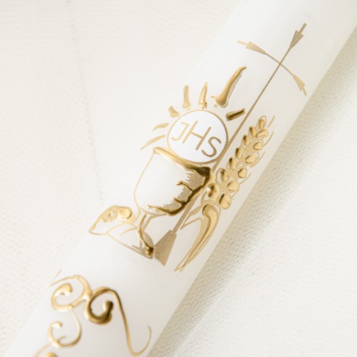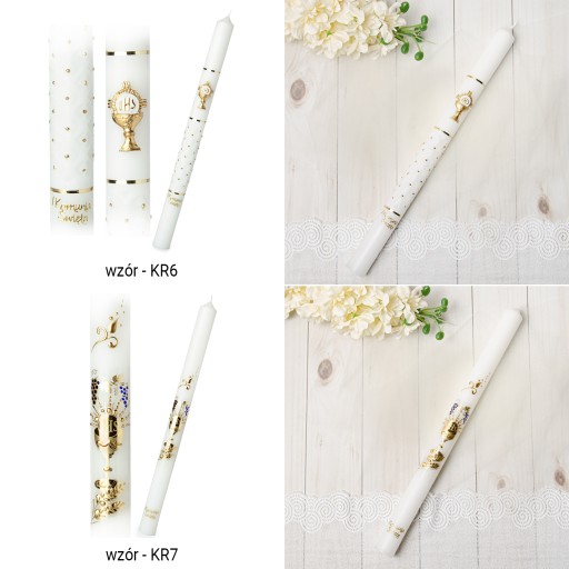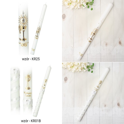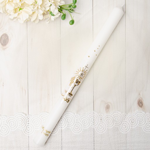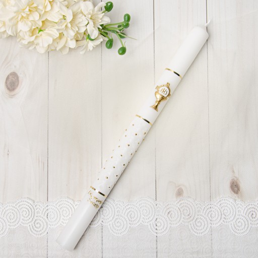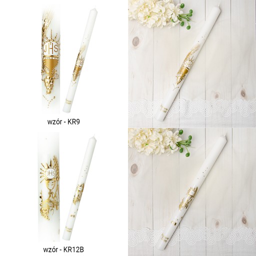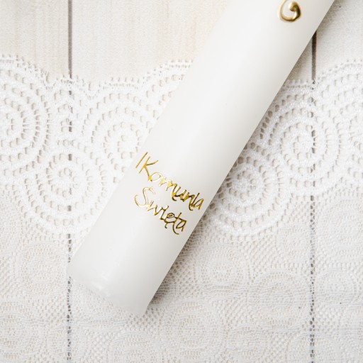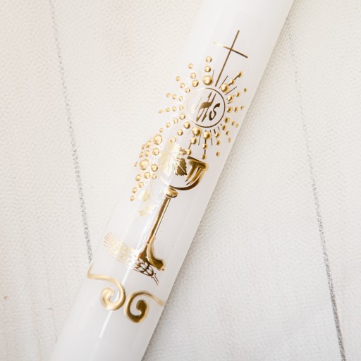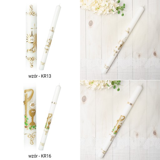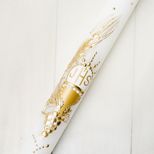 Przedmiotem aukcji jest piękna świeca do Pierwszej Komunii Świętej. Ręczne zdobienie sprawia, iż każdy wzór jest unikatowy.