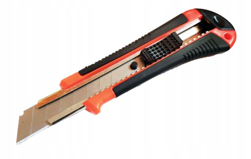 Nożyk wykonany z twardego plastiku. Uchwyty zostały powleczone gumą dla pewniejszego chwytu, antypoślizgowe. W zestawie ostrze łamane 18 mm.