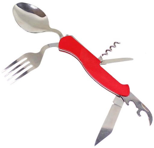- Obiadowy multi tool zawiera w sobie komplet sztućców szczególnie przydatnych na wyjazdach, wycieczkach, obozach, campingach lub np. w samochodzie.