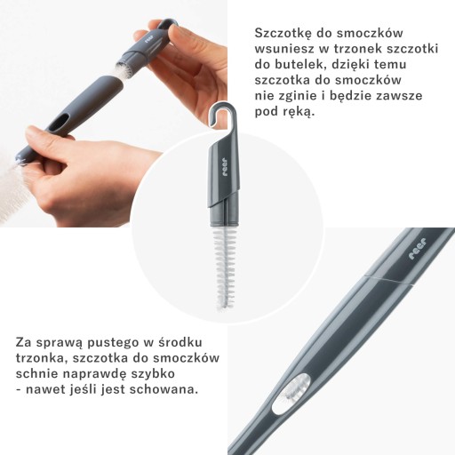 2w1 - szczotka do butelek i zintegrowana szczotka do smoczków i akcesoriów.