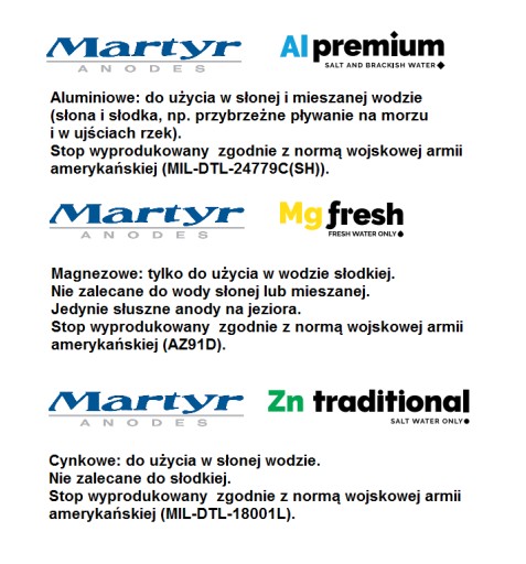 Anody kanadyjskiej firmy MARTYR zapewniają ochronę katodową dla łodzi, konstrukcji morskich i wyposażenia łodzi. Są wykonane ze specjalnego stopu, wykorzystującego tylko metale o wysokiej czystości. Martyr jest jedynym producentem, który oferuje wszystkie trzy stopy chroniące łódź przed korozją, która może wystąpić zarówno w słodkiej, jaki w słonej wodzie. Anody Martyr są odlewane ciśnieniowo i produkowane zgodnie ze ścisłymi standardami jakości systemu zarządzania jakością ISO 9001.