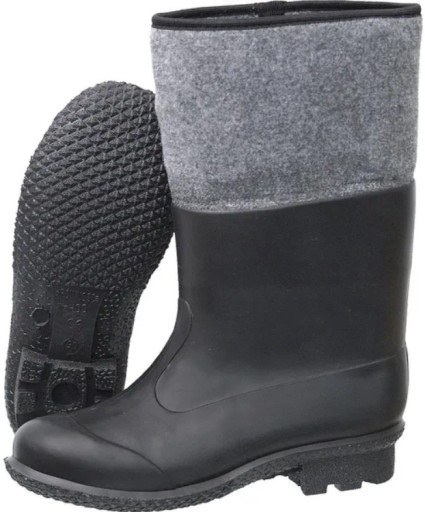 Kalosze do połowy łydki. Gumofilce z filcową cholewą wykonane zostały z PCV. Posiadają olejoodporną podeszwę. W dolnej części całkowicie wodoodporne.
