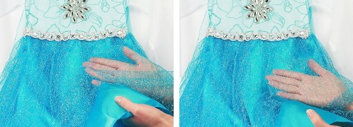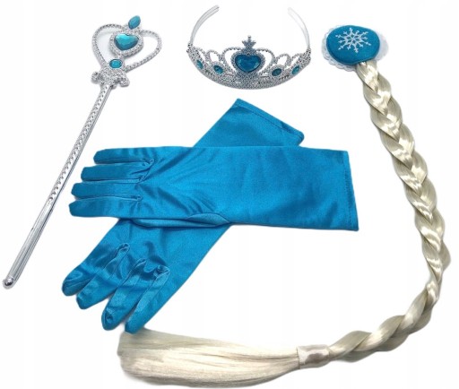 Strój wiernie odwzorowany na podobieństwo sukni Elsy, starannie uszyty z połyskujących i błyszczących materiałów. Na gorsecie przyszyte "brylanciki" w kształcie płatka śniegu, rękawy uszyte z delikatnej białej mgiełki. Dół sukni uszyty z 2 warstw: połyskujący materiał oraz prześwitująca srebrzysta tkanina. Dzieło wieńczy tren mieniący się w tańcu cekinami.
