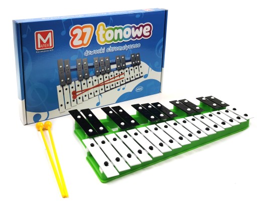 Dzwonki 27-tonowe to instrument, dzięki któremu dziecko poznaje nuty oraz uczy się grać proste melodie przy wykorzystaniu dwóch pałeczek, z pomocą rodzica lub nauczyciela. Zabawa z dzwonkami rozwija zdolności muzyczne dziecka i poczucie rytmu. Na każdej blaszce wytłoczone literowe oznaczenie dźwięku.