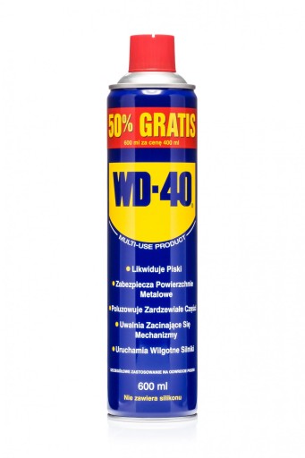 WD - 40 to wielofunkcyjny preparat, który: czyści i konserwuje, likwiduje skrzypienie i piski, usuwa wodę, luzuje zardzewiałe części, uwalnia zacinające się mechanizmy, zabezpiecza metalowe powierzchnie przed korozją. Nie zawiera silikonu.
