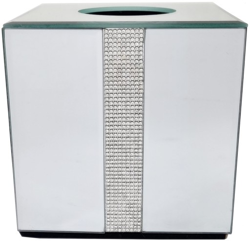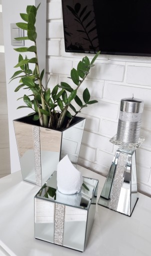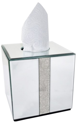 Pudełko na chusteczki z kryształami na przedniej ścianie.. Dno pojemnika jest plastikowe, a środek welurowy. Otwór jest w kształcie koła.