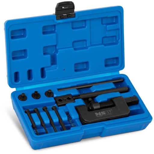 Zakuwarka do łańcuchów motocyklowych jest wykonana z odpornej stali węglowej o długiej żywotności. Narzędzie dostarczamy wraz z praktyczną walizką transportową.