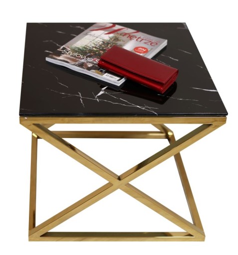 Stolik kawowy tworzy blat ze szkła laminowanego w kolorze czarnego marmuru o grubości 8 mm oraz metalowa konstrukcja o złotym wykończeniu na wysoki połysk.