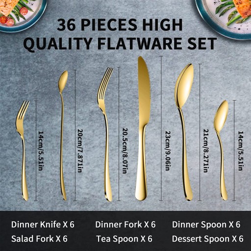 Набор столовых приборов Gold 36 предметов/6 персон, золотые вилки, ложки для латте, богатый набор