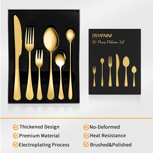 Zestaw złotych sztućców wykonanych z wysokiej jakości stali nierdzewnej 18/8 to odzwierciedlenie nowoczesnego designu.