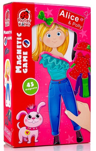 W zestawie są 2 lalki – Alice i jej piesek Polly, a także różnorodne magnesowe ubrania i akcesoria dla tworzenia oryginalnych obrazów. Przebierajcie koleżanki, łączcie elementy garderoby. W książeczce- instrukcji znajdziecie wskazówki, jak można dobierać ubrania.