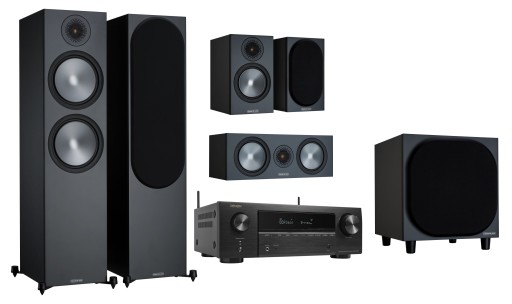 Monitor Audio Bronze 6G kolor Black - czarna obudowa z efektownym grafitowym frontem - zestaw kina domowego 5.1+ topowy amplituner Denon AVR-X1700H, nowy, fabrycznie spakowany kompletny zestaw kina najwyższej klasy.