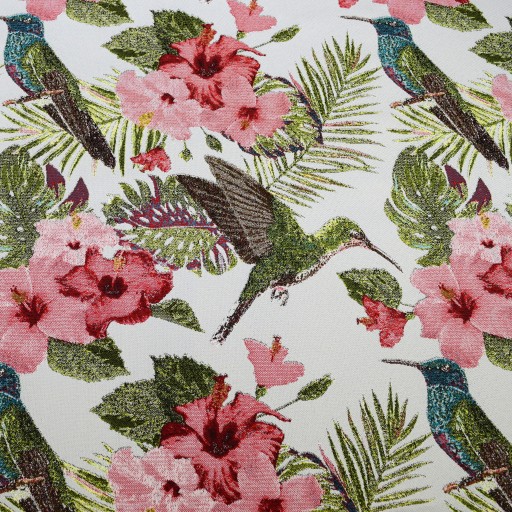 ptaków i tropikalnych kwiatów. Materiał produkowany metodą tkania -