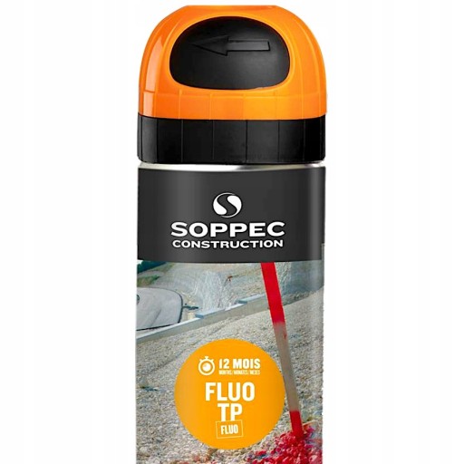 - Farba geodezyjna mocno fluorescencyjna w aerozolu Fluo TP marki Soppec do wykonywania oznaczeń na terenie budowy, o trwałości aż do 12 miesięcy