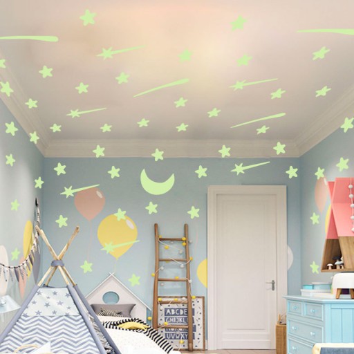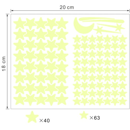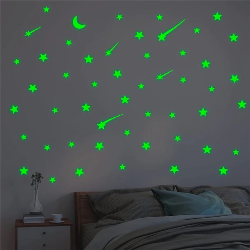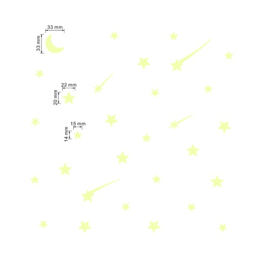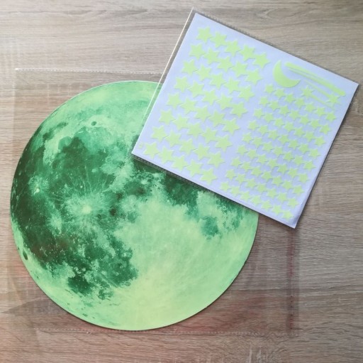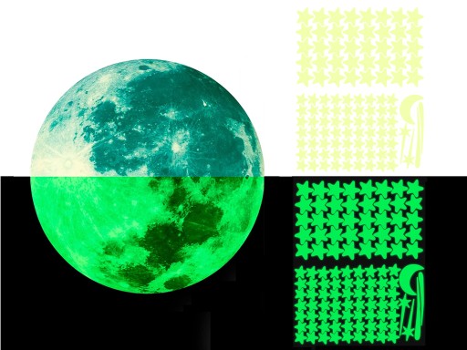W komplecie: piękna naklejka ze świecącym księżycem 3D oraz naklejki gwiazdki.