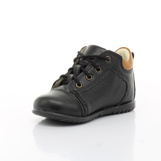 Trzewiki w kolorze czarnym - idealne do nauki chodzenia, wyprodukowane z najwyższej jakości skóry naturalne. Buciki odpowiednio stabilne i elastyczne, wnętrze wyścielone mięciutka skórą, co chroni przed otarciem. Wkładka skórzana profilowana - odpowiednio kształtuje rozwój stopy. Zapięcie regulowane sznurówką. Posiadają szeroki czubek, co daje swobodę paluszkom. Podeszwa elastyczna oraz antypoślizgowa.