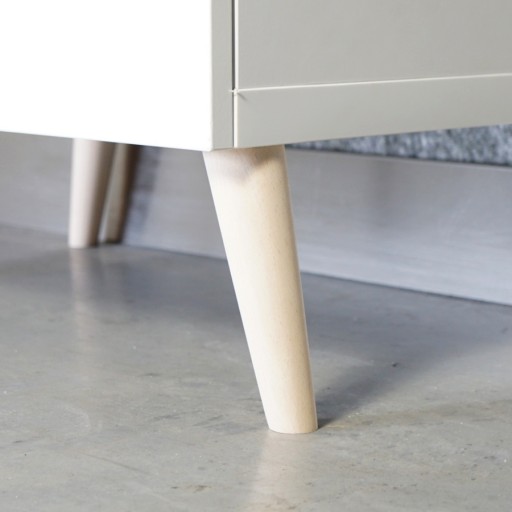 Nogi bukowe skośne, surowe, toczone w formie stożka. Nóżka posiada szpilkę z gwintem metrycznym M8, którą można w prosty sposób zamontować w mebel tapicerowany- za pomocą wkręcenia lub dokupując inne blachy montażowe, nakrętki, które są dostępne w naszej ofercie. Montażu można dokonać również za pomocą muf wkręcanych w mebel, w drewno lub płytę z gwintem wewnętrznym M8. Do ochrony podstaw polecamy nasze ślizgacze lub filce dostępne w ofercie. Nóżkę można wg własnych potrzeb pomalować lakierem bezbarwnym lub wybarwić na dowolny kolor bejcą lub lakierem. Nóżki występują w innych wysokościach. Wykonane są z drewna liściastego, z jednego elementu - nie są klejone, przez co są dużo bardziej wytrzymałe. Wytrzymują nacisk około 60 kg/szt.