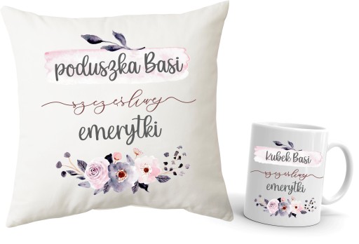 Zestaw prezentowy z imieniem dla osoby przechodzącej na Emeryturę: KUBEK + PODUSZKA z wypełnieniem