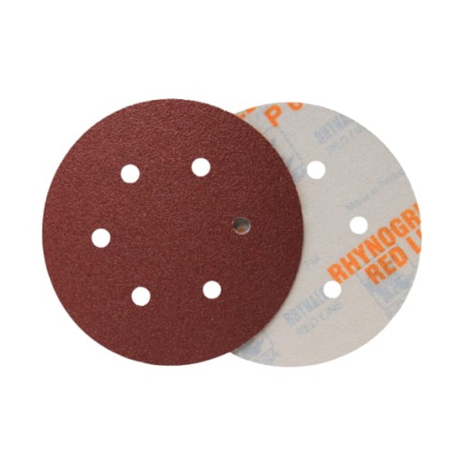 Krążki ścierne na rzep INDASA Rhynogrip Red Line 6-cio otworowe o średnicy 150 mm przeznaczone są zarówno do szlifierek mimośrodowych, orbitalnych, kątowych jak i do szlifowania ręcznego na sucho.