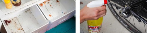 Szafki kuchenne, Blat kuchenny, Okap kuchenny i filtry, Patelnia, Piekarniki, Kuchenka gazowa, Kuchenka ceramiczna, Krajalnice, Zamrażarka, Lodówka, Kaloryfery, Rolety, Plamy na zmywalnych ścianach, Podłogi zewnętrzne, Podłogi garażowe, Kuchenki i szyby kominkowe, Plamy na dywanach, Plamy na wykładzinach dywanowych, Tapicerkach tekstylnych i skórzanych, Parapety z kamienia, Pojemniki na śmieci, Ekspresy do kawy, Włączniki światła, Lampy, Ramy drzwi i okien, Popielniczki, Sztuczne rośliny, Miotły, Telefony, Piórnik do szkoły , Plecak szkolny, Plamy z atramentu, Podłogi garażowe.