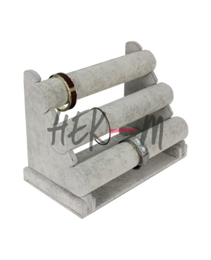 Ekspozytor wałek potrójny z aksamitnego miłego w dotyku weluru służy do ekspozycji bransoletek, opasek, zegarków oraz ekspozycji wszelkiego rodzaju biżuterii naręcznej, wałki w trzech wysokościach pozwalają zagospodarować małą powierzchnię przy większej ilości biżuterii