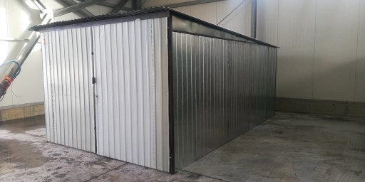 Garaż blaszany 2x3 II Gatunek, blacha trapezowa, spad dachu do tyłu z bramą dwuskrzydłową.
