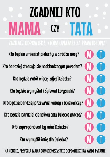 W tej grze, każda z uczestniczek otrzymuje swoją kartę ankietę, w której zaznacza odpowiedź na pytanie - Mama lub Tata - według własnego uznania.