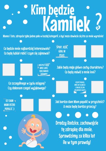 Szukacie pomysłu na wyjątkową zabawę na Baby Shower? Wykorzystajcie naszą zdrapkę w formie plakatu, który pozwoli Rodzicom sprawdzić kim będzie ich Syn w przyszłości:)