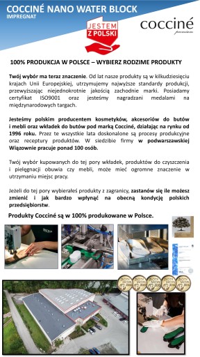 Cocciné Nano Water Block zawiera nanocząsteczki, co czyni go najskuteczniejszym impregnatem. Działa najdłużej, szybko tworzy się powłoka ochronna, jest bardzo skuteczny i wielofunkcyjny – ochronisz nim nie tylko buty, ale i parasole, czapki a nawet ... namiot