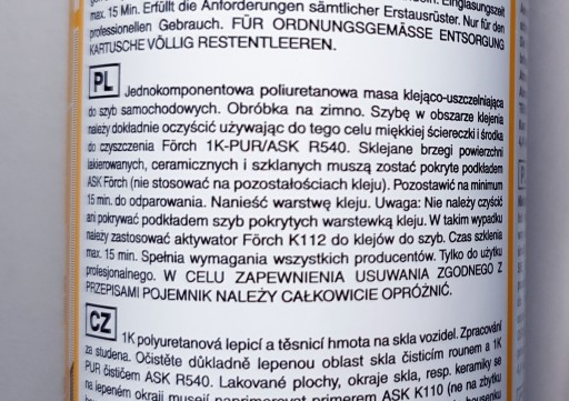 1szt. Klej marki FORCH 310ml. wraz z DYSZĄ, do klejenia szyby z nadwoziem samochodu. Nie służy do klejenia plastików. Zaletą tego kleju na tle konkurencji jest to że po nałożeniu na szybę jest dość/bardziej sztywny, co pozwala na precyzyjniejsze i pewniejsze ustawienie szyby po zamontowaniu. Taka pojemność wystarcza na zamontowanie szyby do samochodu osobowego.