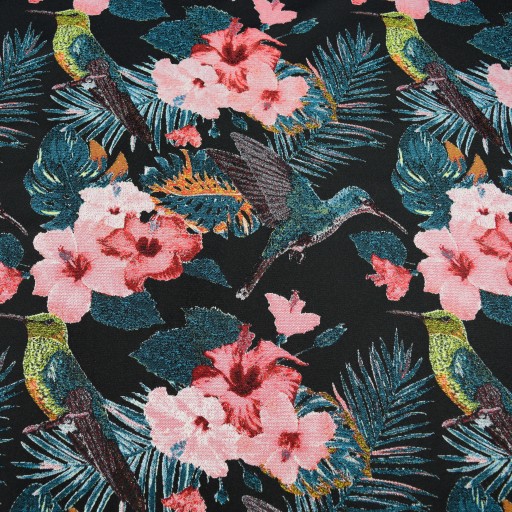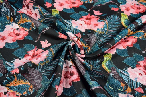 ptaków i tropikalnych kwiatów. Materiał produkowany metodą tkania -