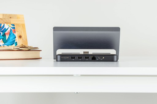 Stacja dokując z portem USB i gniazdem audio z przodu oraz tylne złącza 3xUSB, Ethernet i HDMI umożliwiają podłączenie zewnętrznego wyświetlacza, klawiatury i innych urządzeń, zapewniając wygodę pracy porównywalną ze środowiskiem komputerów stacjonarnych.