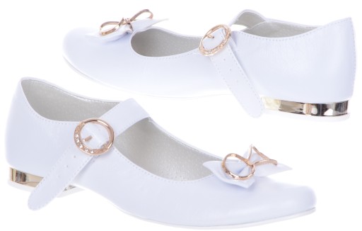 Przepiękne buty do pierwszej komunii świętej, wygodne czółenka/baleriny komunijne. Cholewka wykonana została ze skóry ekologiczne. Buty posiadają ponadto skórzaną profilowaną wkładkę. Lekkie, bardzo wygodne! Wykonane z dbałością o szczegóły. Buciki na białym, niskim obcasie z wstawką w kolorze złotym. Zdobione eleganckimi białymi kokardkami z efektowną klamrą. Doskonale sprawdzą się podczas uroczystych okazji. Produkt w całości wykonany w Polsce przez firmę MIKO