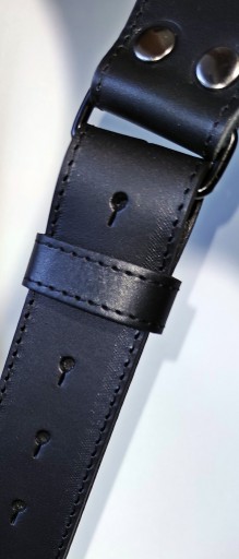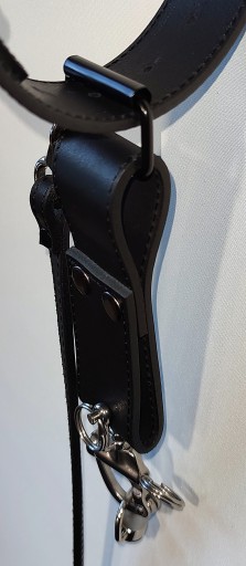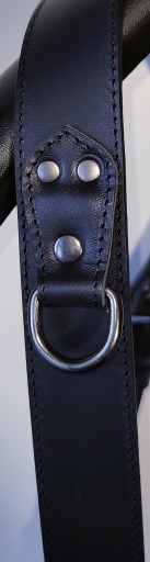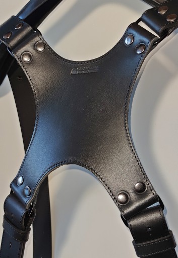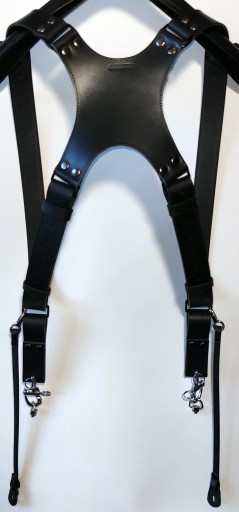 Szelki w kolorze czarnym, przeszyte czarną nicią, wykonane ze skóry naturalnej najwyższej jakości z dbałością o najdrobniejszy detal. Podkładka na plecy dodatkowo od strony wewnętrznej jest podszyta miękką skórą perforowaną. Szelki posiadają bardzo dużą skalę regulacji, także po odpowiednim ustawieniu będą pasować na każdego. Aparat mocowany jest do szelek poprzez wysokiej jakości stalową śrubę fotograficzną 1/4'' osadzoną na szekli żeglarskiej z krętlikiem(według specyfikacji producenta uszkodzenie szekli następuje przy obciążeniu 3600kg). Paski asekuracyjne są wykonane także ze skóry naturalnej co gwarantuje bardzo dobrą ochronę sprzętu jak i dopełnienie wizerunku estetycznego szelek. Całość zamocowana jest na szelkach z wykorzystaniem ramki rymarskiej o grubości 3 mm i paska wykonanego z tej samej skóry z której zostały wykonane szekli. Szerokość szelek - 4 cm a grubość skóry - 3-4 mm. Szelki wykonujemy samodzielnie w małym zakładzie kaletniczym dlatego czas oczekiwania to ok 3 dni roboczych.