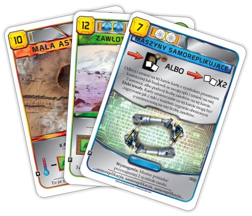 Karta leżąca na projekcie Maszyn samoreplikujących może być następnie zagrana na stół w zwykły sposób, tak jakby znajdowała się w naszej ręce. Dodatkowo, każdy znacznik surowca jaki zdążyliśmy na niej zgromadzić, obniża koszt jej wyłożenia o 1 (nie jest to stal ani tytan).