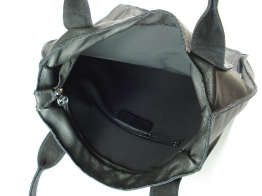 Wnętrze składa się z obszernej materiałowej podszewki ,dodatkowo posiada kieszonkę na zamek oraz dwie kieszonki na drobiazgi.