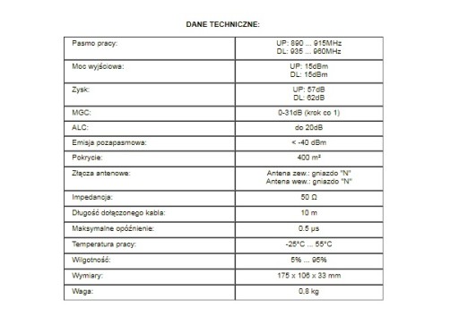 - Urządzenie przeznaczone dla telefonów GSM, pracuje w paśmie 890-960MHz -powszechnie stosowanym sieciach Orange, Plus, T-Mobile, Play, Heya, TakTak itp. wzmocnienie sygnału odpowiednie do deklarowanego zasięgu