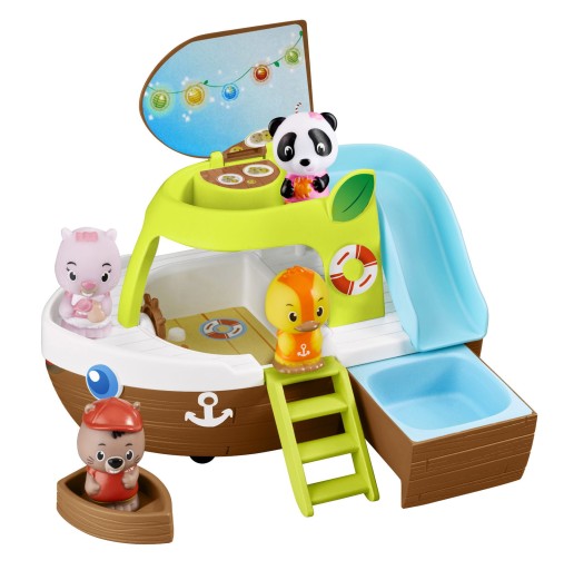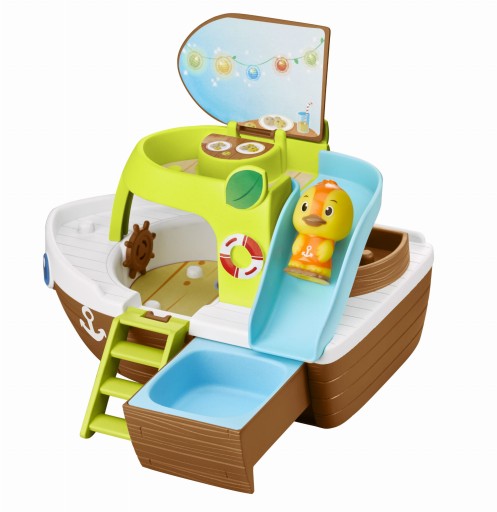 - Zestaw zawiera: stateczek wycieczkowy z basenem, jedno zwierzątko, łódź ratunkowa, wyciągana drabinka.