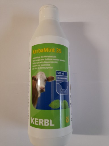 Preparat do pielęgnacji wymion Kerba Mint z zawartością 35% olejku z mięty pieprzowej. Regularne stosowanie pozwala utrzymać wymiona zdrowe i poprawia jakość mleka. Stosuje się również do masażu stawów, mięśni, ścięgien. Opakowanie 500ml.