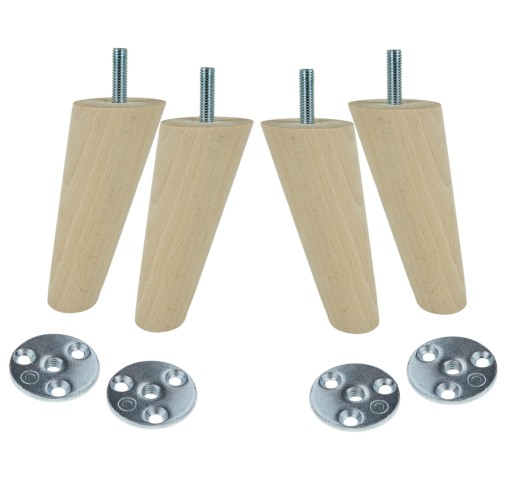 Nogi bukowe, skośne, surowe, toczone w formie stożka. Nóżka posiada szpilkę z gwintem metrycznym M8, którą można w prosty sposób zamontować w mebel tapicerowany- za pomocą wkręcenia lub dokupując inne blachy montażowe, nakrętki, które są dostępne w naszej ofercie. Montażu można dokonać również za pomocą muf wkręcanych w mebel, w drewno lub płytę z gwintem wewnętrznym M8. Do ochrony podstaw polecamy nasze ślizgacze lub filce dostępne w ofercie. Nóżkę można wg własnych potrzeb pomalować lakierem bezbarwnym lub wybarwić na dowolny kolor bejcą lub lakierem. Nóżki występują w innych wysokościach. Wykonane są z drewna liściastego, z jednego elementu - nie są klejone, przez co są dużo bardziej wytrzymałe. Wytrzymują nacisk około 60 kg/szt.