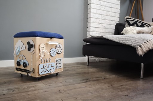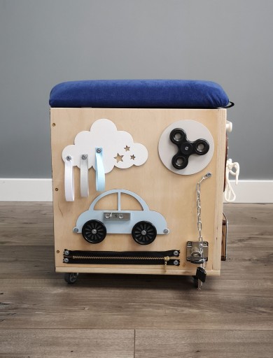 Każdy bok skrzyni to inne aktywności dla dziecka.