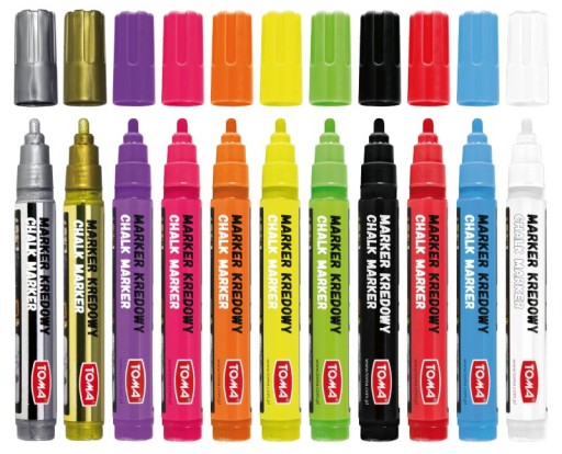 Marker z płynną kredą, do pisania po tablicach czarnych, białych, po szkle i powierzchniach plastikowych. Idealny do cenówek kredowych. Zmywalny wodą, jak zwykła kreda. Nasączalne końcówki fibrowe, bezwonny tusz pigmentowy, nie zawiera xylenu. Końcówka okrągła - grubość linii pisania 4,5 mm