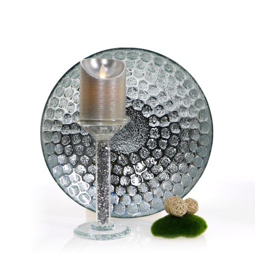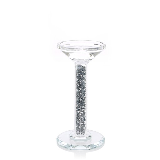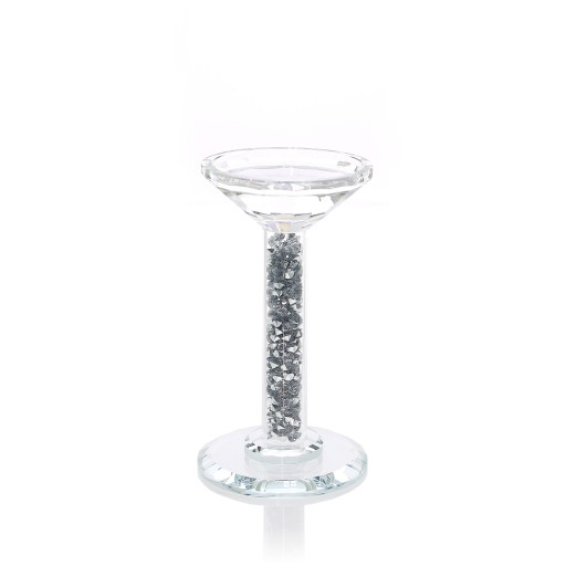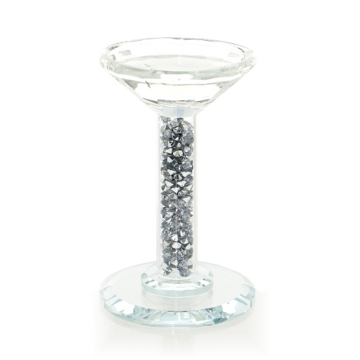 Przedstawiamy Państwu elegancki, szklany komplet świeczników w stylu glamour wykonany z dbałością o każdy szczegół. Świeczniki te posiadają dekoracje w postaci srebrnych drobinek kryształków zamkniętych w stopce.