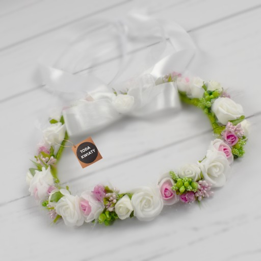 - Subtelny wianek wykonany ręcznie z delikatnych sztucznych kwiatków piankowych oraz dodatkow florystycznych dobrej jakosci
