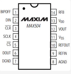 MAX504/MAX515 to 10-bitowe przetworniki cyfrowo-analogowe (DAC) o niskim poborze mocy, z wyjściem napięciowym, przeznaczone do pracy z pojedynczym zasilaniem +5V. MAX504 może być również zasilany napięciem ±5V. MAX515 pobiera tylko 140 µA, a MAX504 (z wewnętrznym odniesieniem) pobiera tylko 260 µA. MAX515 jest dostępny w 8-pinowych pakietach DIP i SO, podczas gdy MAX504 jest dostępny w 14-pinowych pakietach DIP i SO. Obie części zostały przycięte pod kątem napięcia niezrównoważenia, wzmocnienia i liniowości, więc dalsza regulacja nie jest konieczna. Bufor MAX515 jest ustawiony na wzmocnienie 2. Wewnętrzny wzmacniacz operacyjny MAX504 może być skonfigurowany na wzmocnienie 1 lub 2, a także na unipolarne lub bipolarne napięcia wyjściowe. MAX504 może być również używany jako czterokwadrantowy mnożnik bez zewnętrznych rezystorów lub wzmacniaczy operacyjnych. Informacje o równoległym wprowadzaniu danych można znaleźć w arkuszu danych MAX503.