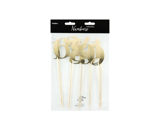 Prezentowane toppery w kształcie pikerów - cyferek na patyczkach wykonano z wysokiej jakości lustrzanego papieru w kolorze złotym. Ostro zakończone drewniane patyczki sprawiają, że gadżet łatwo wbija się w każdy wypiek i jest stabilnie umieszczony.