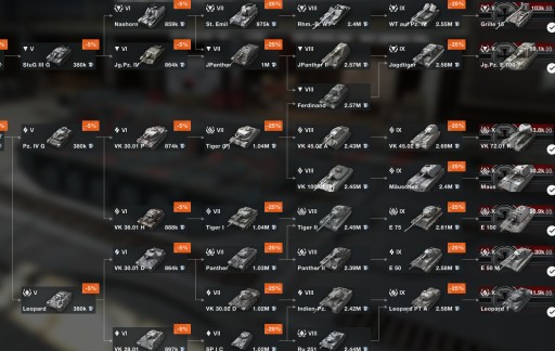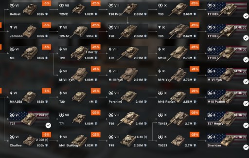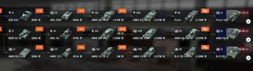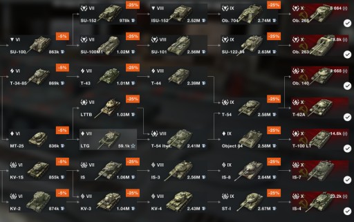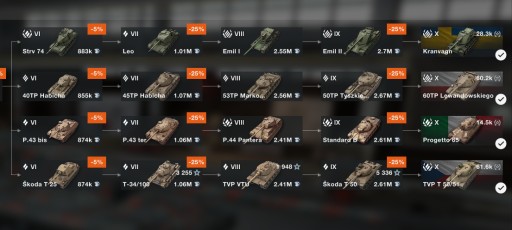 - Premium (złote): T34, IS-2Sh, WZ-120-1G FT, LT-432, STG, IS-6, T-2020, SU-130PM, Chimera, Chieftain, Type 59, AMX Defender, Lorraine 40t, B-C Bourrasque, Somua SM