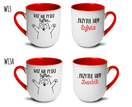 - Kolor kubka: biały błyszczący z kolorowym uszkiem wnętrzem