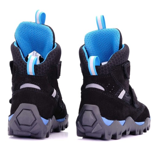 Kozaczki wykonane są ze skóry naturalnej z membrany Brtk-tex waterproof, która chroni stopy przed zamoczeniem i pozwala na oddychanie stóp wewnątrz obuwia. Zawinięty nosek na czubku buta dodatkowo chroni skórę przed uszkodzeniami. Trzewiki ocieplone są wełną 100% i dodatkowo wyposażone w elementy odblaskowe dzięki, którym rodzice mogą być spokojniejsi o ich bezpieczeństwo na drodze, widoczność dziecka wtedy zwiększa się dla osób kierujących pojazdem.