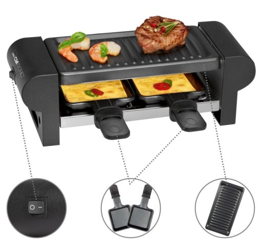 Mały, zgrabny grill typu raclette dla dwóch osób. Zajmuje niewiele miejsca, ale powierzchnię grillową ma jak przeciętny stołowy grill, ze względu na to, że płyta podzielona jest na dwa poziomy.